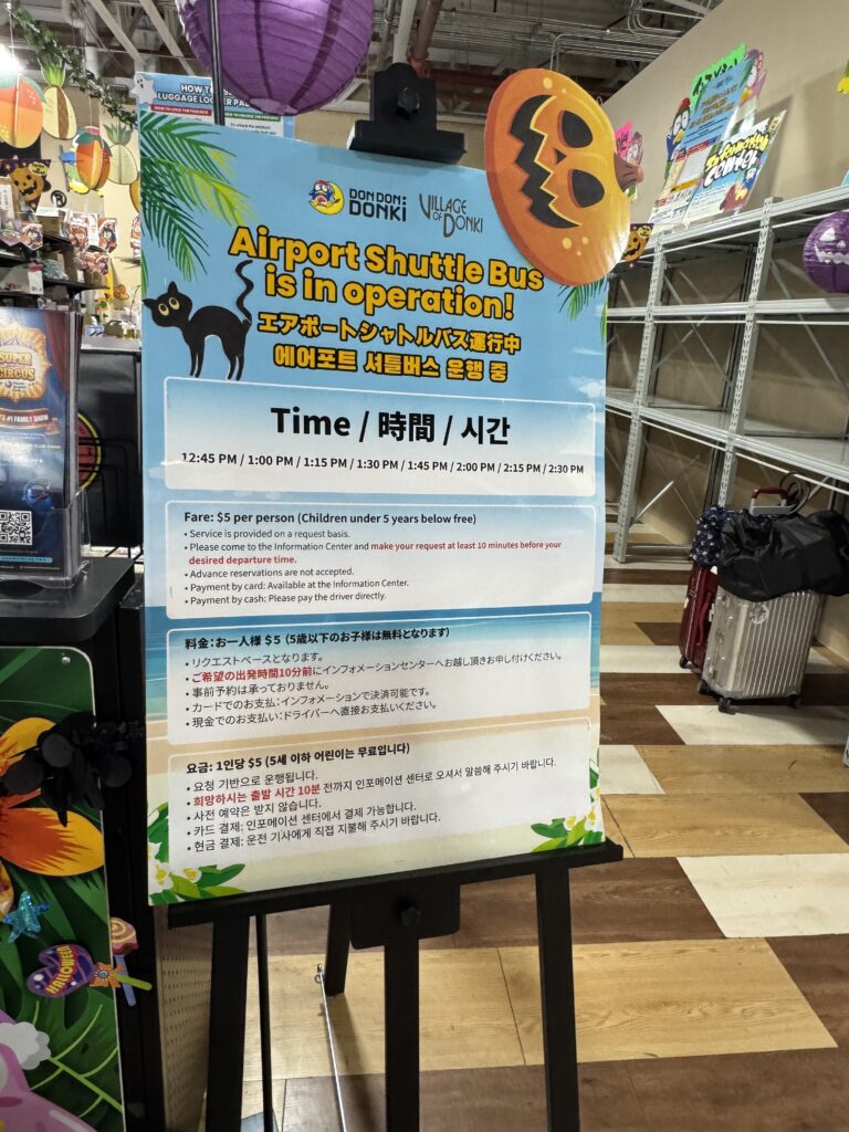 - ドンキから空港へのシャトルサービス(毎日午後12:45~14:15に15分おきに運行中(お一人様$5、現金のみ))