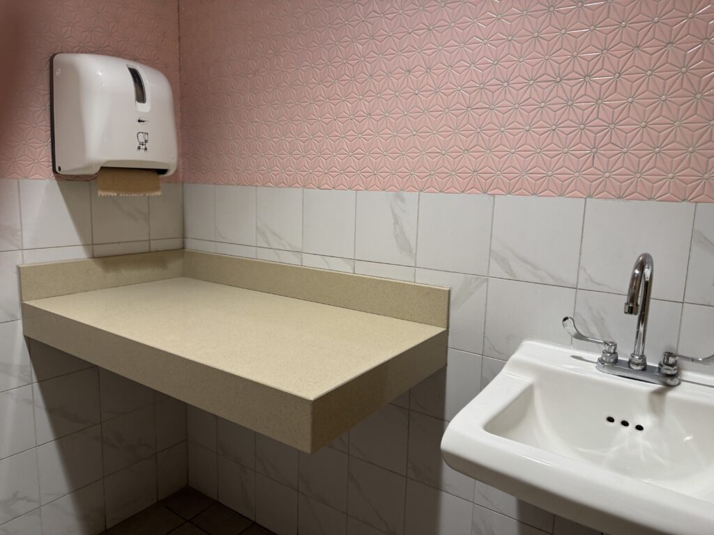 個室内は十分な広さはありましたが、こちらの写真のように、テーブルのような硬めの台と水道とペーパータオルだけが備え付けてあるのみで、日本のようにベルトが付いているものでは無かったので、目を離さないように注意が必要です。それから、おむつ替えシートや頭側にも保護のためのタオルのようなものがあればいいかもしれないです。