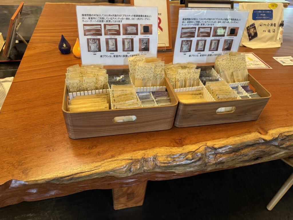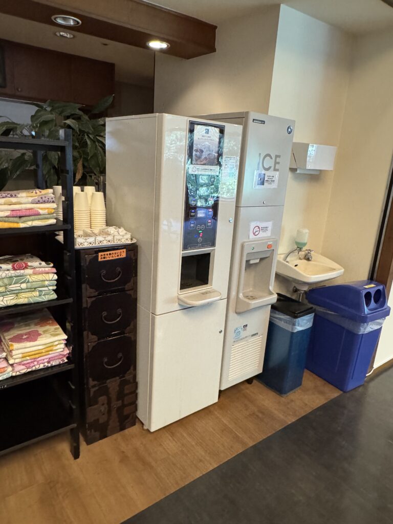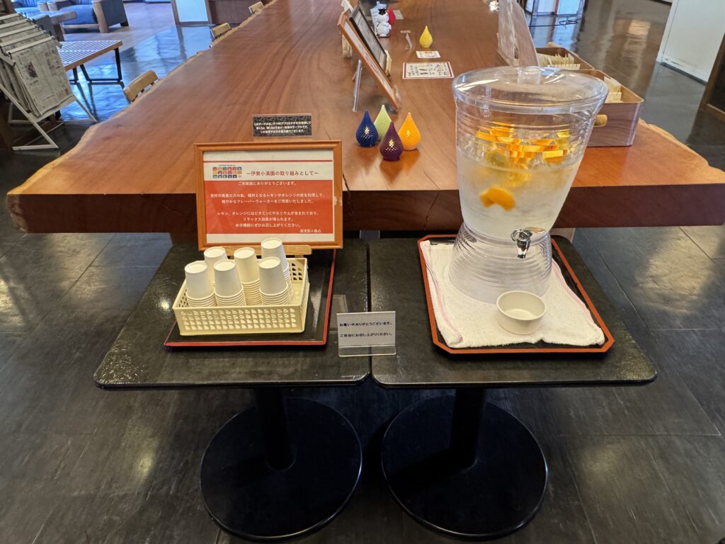 伊東小涌園の1階フロントフロアには、アメニティバー、浴衣コーナー、コーヒー&お茶マシン、フレーバーウォーターなどが揃っています。