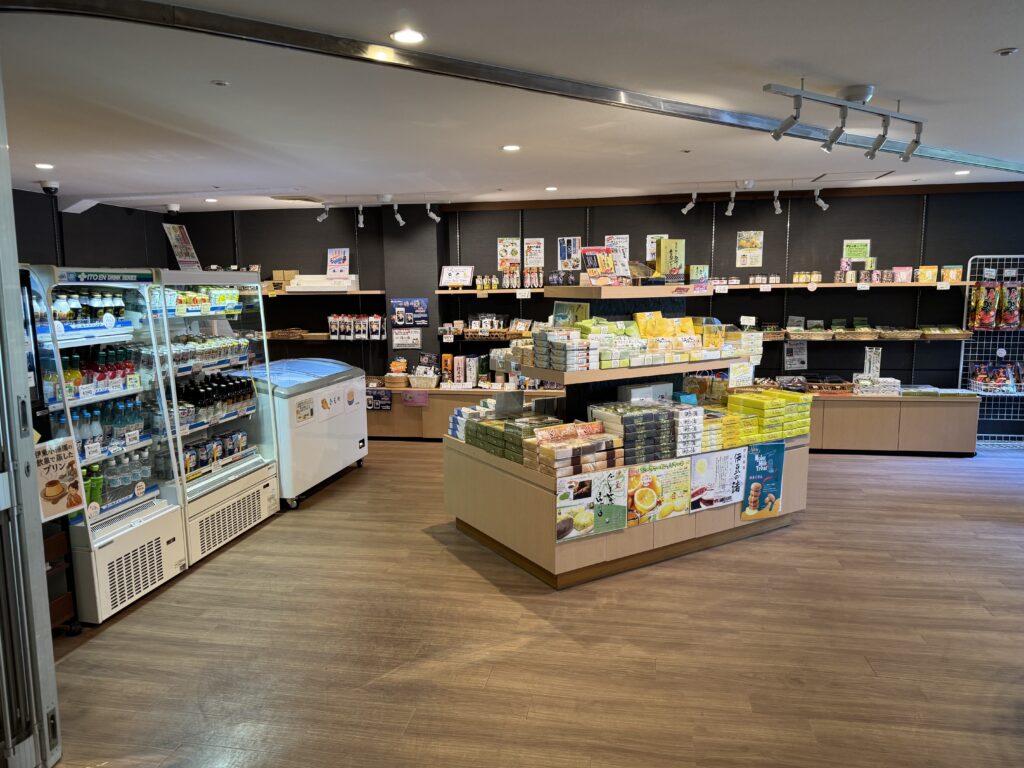 売店にはお土産・ドリンク・アイス・おつまみもあり、チェックイン後のちょっとした買い物にも便利。