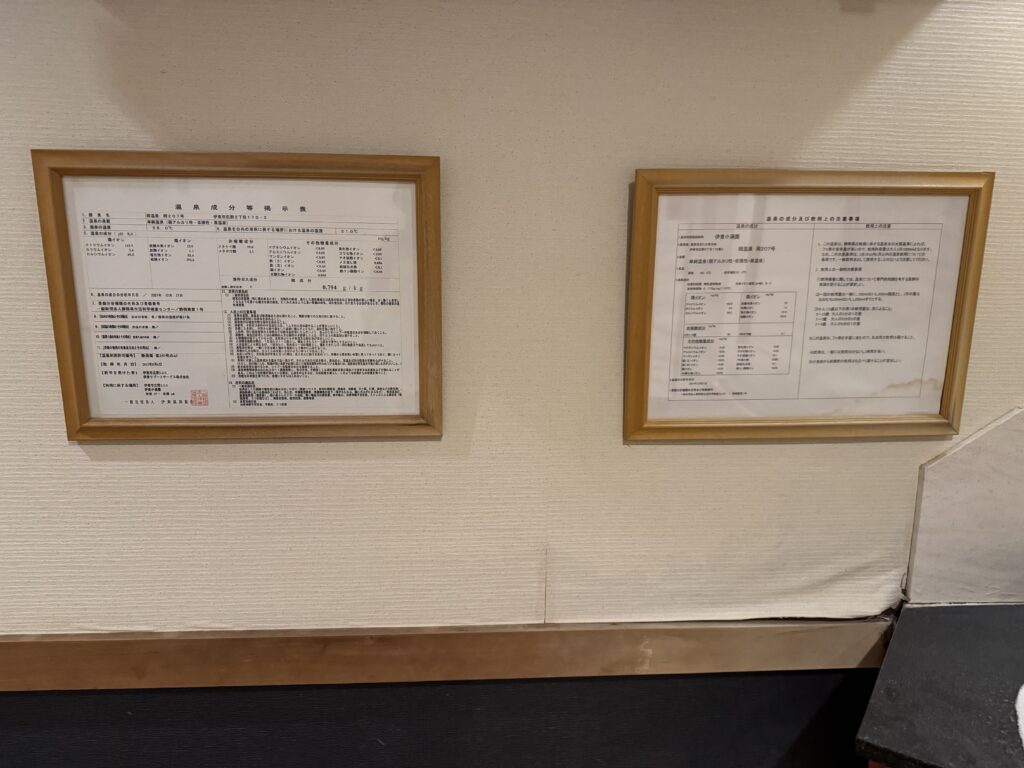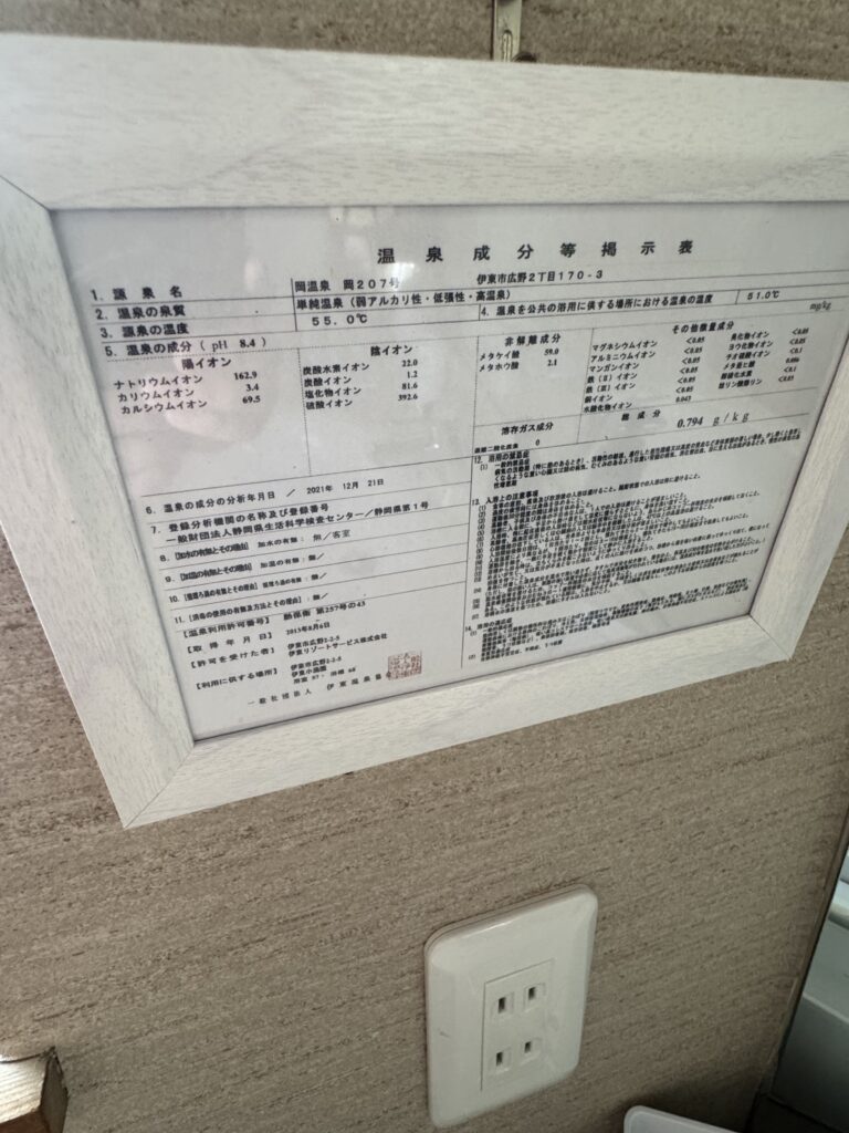 洗面台横にはしっかりと温泉成分表が掲示されており、自家源泉の湯を贅沢に堪能できます。