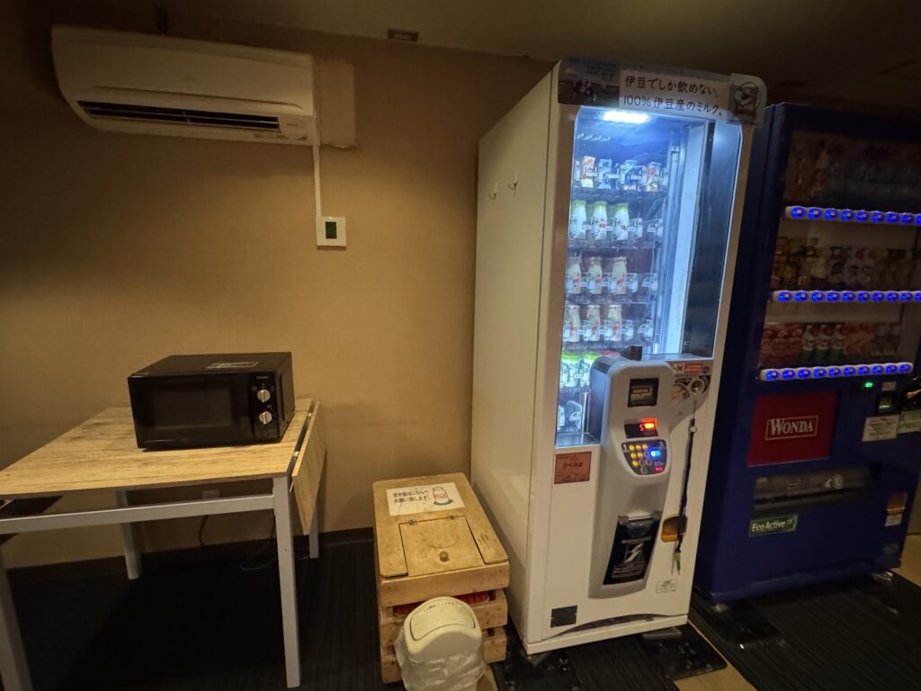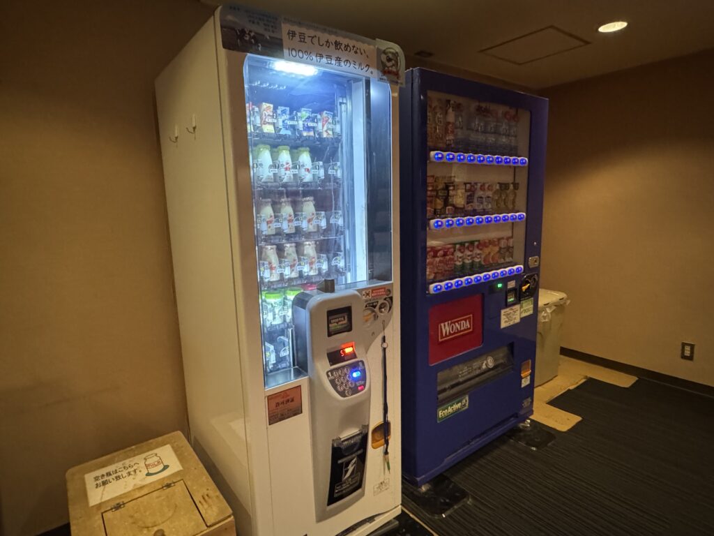 温泉のあるB1階の「くつろぎ処」には、マンガコーナーと自販機があり、地元限定の「伊豆産100%ミルク」や「ミルクプリン」が販売されています。
