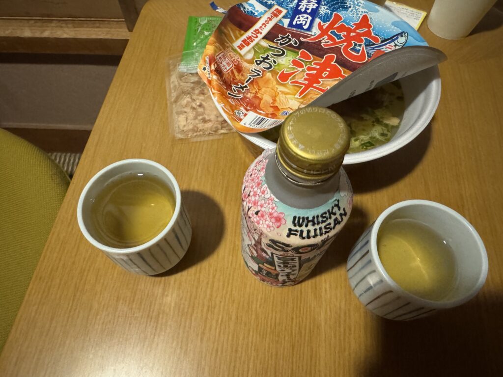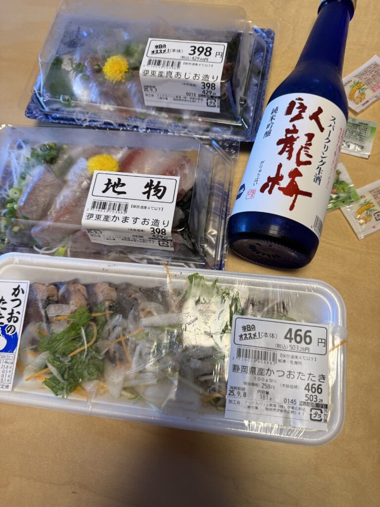 小田原で買ったおつまみや、隣接する24時間営業のマックスバリューで購入した鯵の刺身・地酒などで晩酌を楽しみました。