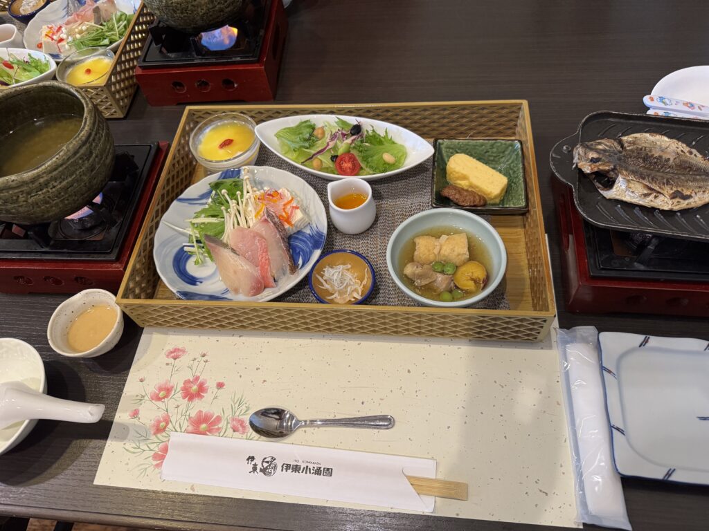 朝食:名物「海鮮しゃぶ鍋」と焼きたて鯵の干物が絶品🐟